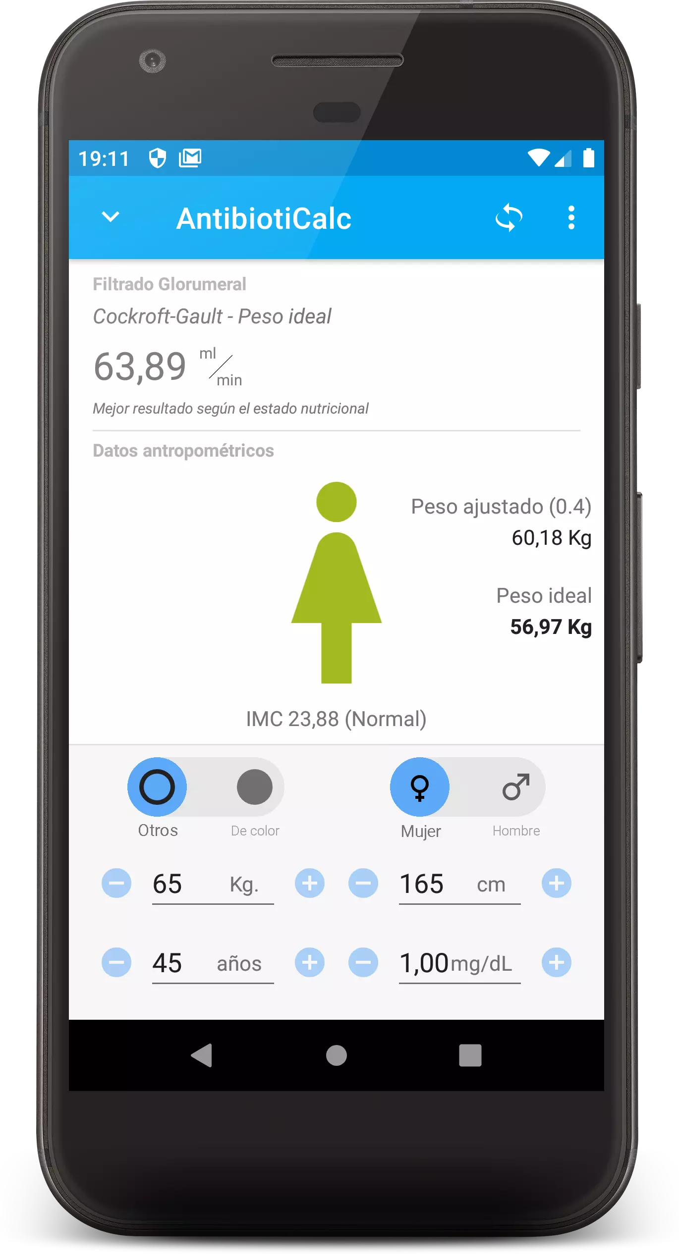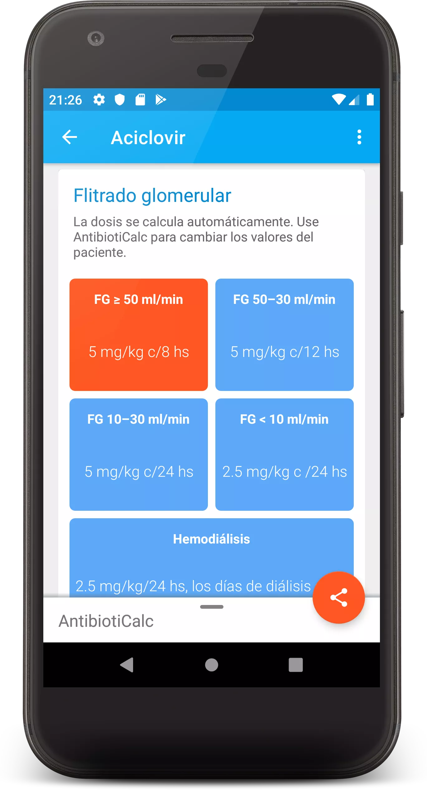 • Calculadora (múltiples parámetros) para ajuste de dosis según peso y función renal alterada.